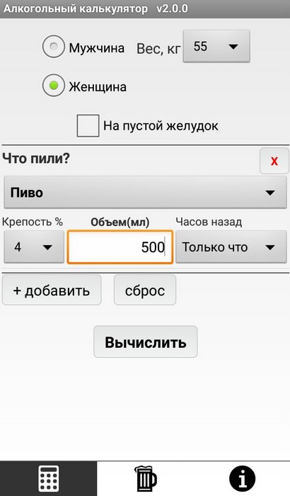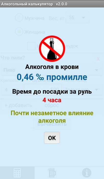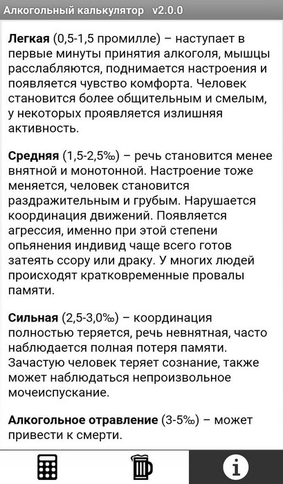 Приложение представляет собой своеобразный аналог алкотестера только в электронном формате. Такой калькулятор можно использовать в двух вариантах: